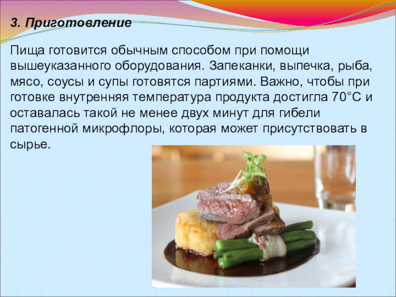 рыба, мясо, соусы и супы готовятся партиями. Важно, чтобы при готовке внутренняя температура продукта достигла 70°С и оставалась такой не менее двух минут для гибели патогенной микрофлоры, которая может присутствовать в сырье.