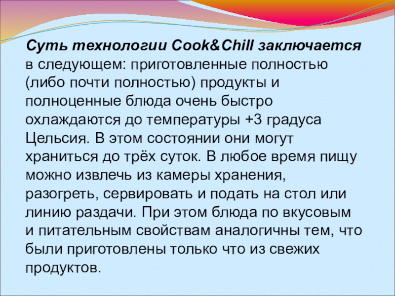 Слайд 6Суть технологии Cook&Chill заключается в следующем: приготовленные полностью (либо почти полностью)