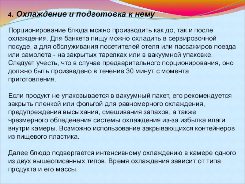 так и после охлаждения. Для банкета пищу можно охладить в сервировочной посуде, а для обслуживания посетителей отеля или пассажиров поезда или самолета - на закрытых тарелках или в вакуумной упаковке. Следует учесть, что в случае предварительного порционирования, оно должно быть произведено в течение 30 минут с момента приготовления.