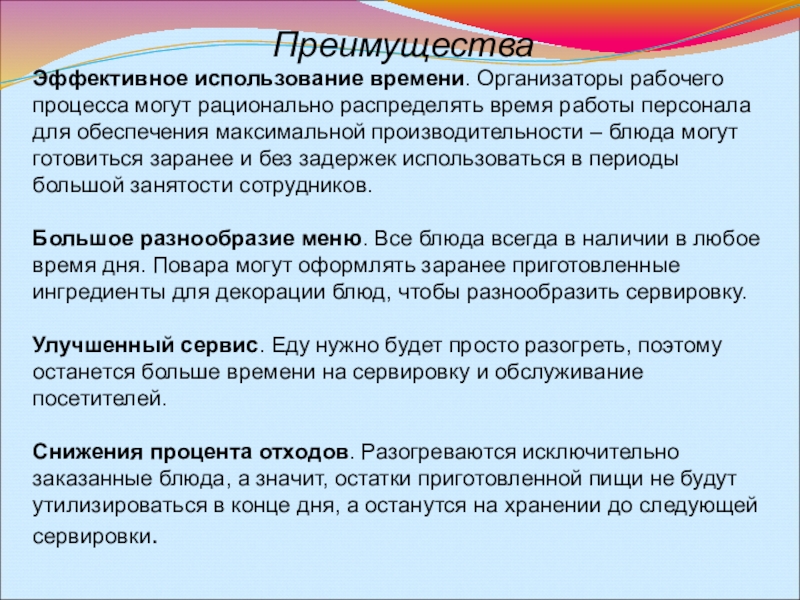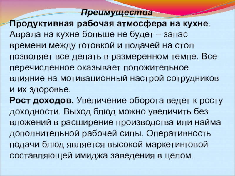 – запас времени между готовкой и подачей на стол позволяет все делать в размеренном темпе. Все перечисленное оказывает положительное влияние на мотивационный настрой сотрудников и их здоровье.