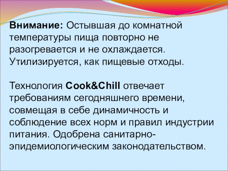 Слайд 21Внимание: Остывшая до комнатной температуры пища повторно не разогревается и не охлаждается.