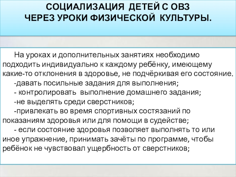 занятиях необходимо подходить индивидуально к каждому ребёнку, имеющему какие-то отклонения в здоровье, не подчёркивая его состояние.
