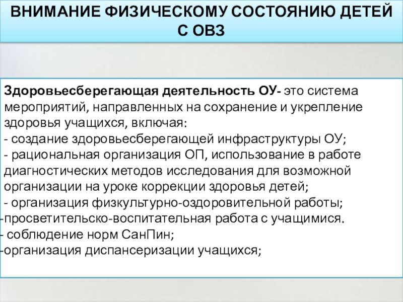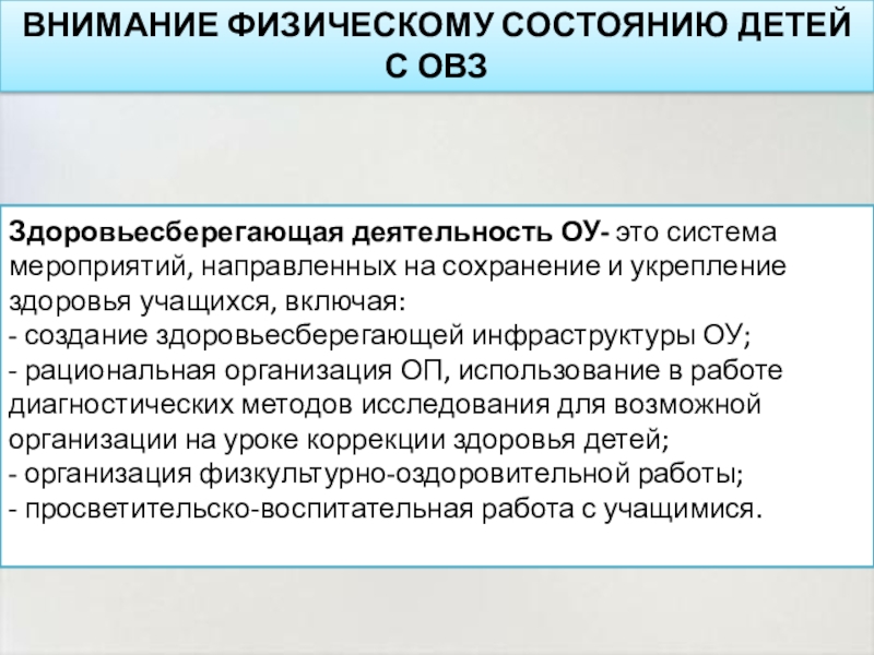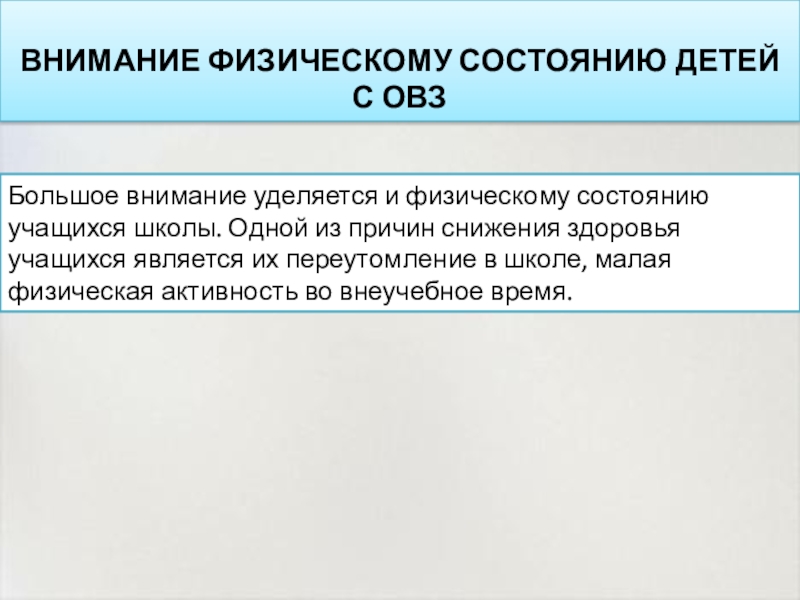 Слайд 15ВНИМАНИЕ ФИЗИЧЕСКОМУ СОСТОЯНИЮ ДЕТЕЙ С ОВЗ