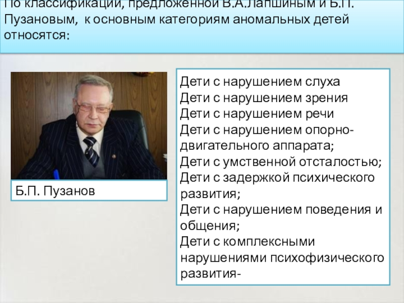 По классификации, предложенной В.А.Лапшиным и Б.П. Пузановым, к основным категориям аномальных детей относятся: