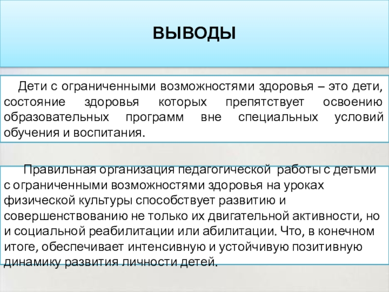 Правильная организация педагогической работы с детьми с ограниченными возможностями здоровья на уроках физической культуры способствует развитию и совершенствованию не только их двигательной активности, но и социальной реабилитации или абилитации. Что, в конечном итоге, обеспечивает интенсивную и устойчивую позитивную динамику развития личности детей.