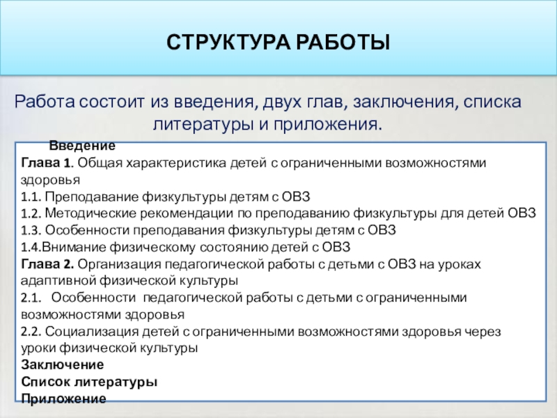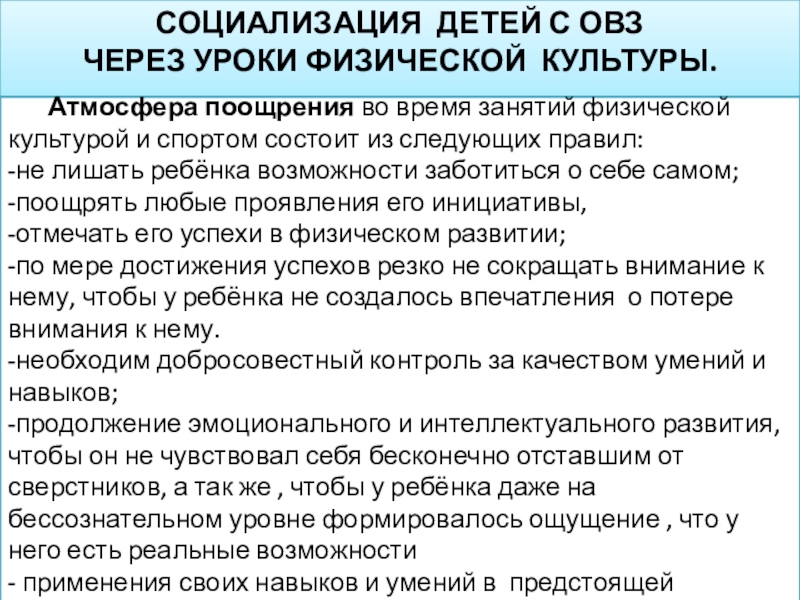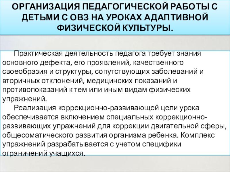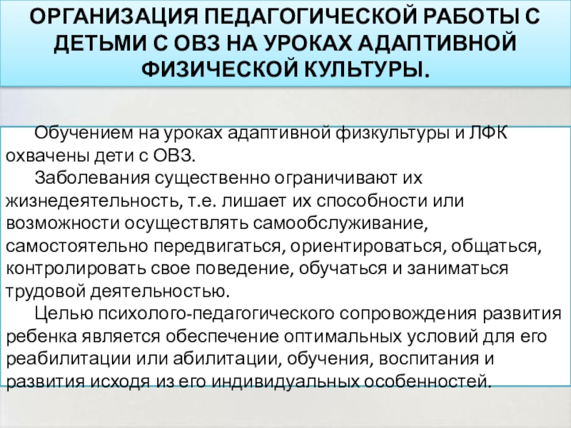 Слайд 18ОРГАНИЗАЦИЯ ПЕДАГОГИЧЕСКОЙ РАБОТЫ С ДЕТЬМИ С ОВЗ НА УРОКАХ АДАПТИВНОЙ ФИЗИЧЕСКОЙ