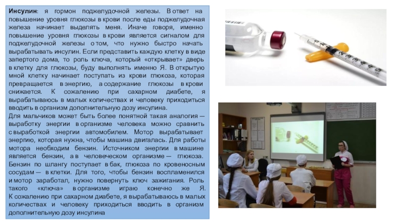 Слайд 13Инсулин: я гормон поджелудочной железы. В ответ на повышение уровня глюкозы в крови