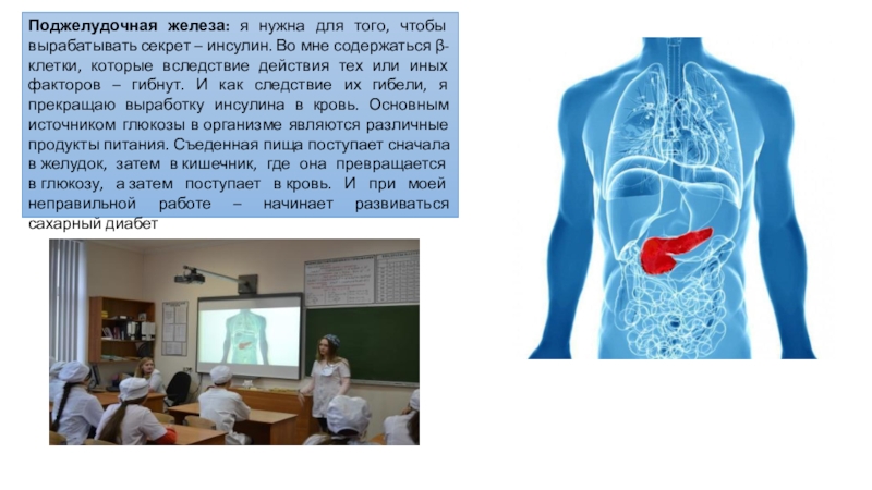 Слайд 11Поджелудочная железа: я нужна для того, чтобы вырабатывать секрет – инсулин.