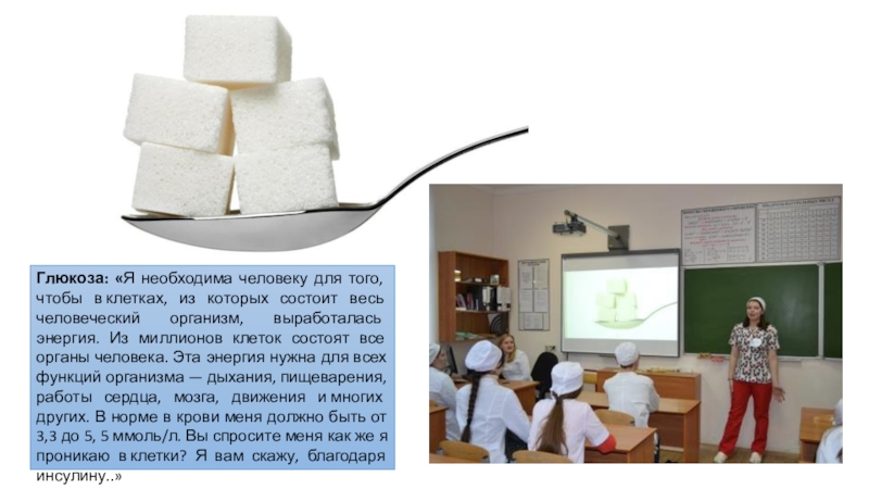 весь человеческий организм, выработалась энергия. Из миллионов клеток состоят все органы человека. Эта энергия нужна для всех функций организма — дыхания, пищеварения, работы сердца, мозга, движения и многих других. В норме в крови меня должно быть от 3,3 до 5, 5 ммоль/л. Вы спросите меня как же я проникаю в клетки? Я вам скажу, благодаря инсулину..»