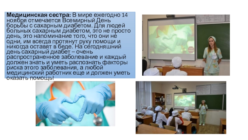 Слайд 19Медицинская сестра: В мире ежегодно 14 ноября отмечается Всемирный День борьбы