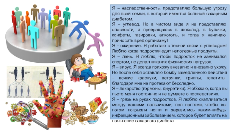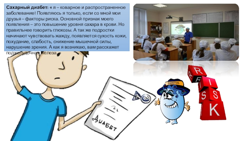 Слайд 10Сахарный диабет: « я – коварное и распространенное заболевание! Появляюсь я