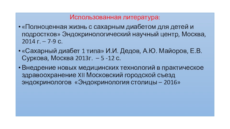 «Сахарный диабет 1 типа» И.И. Дедов, А.Ю. Майоров, Е.В. Суркова, Москва 2013г. – 5 -12 с.
