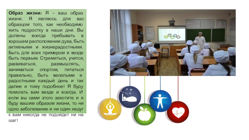 образцом того, как необходимо жить подростку в наши дни. Вы должны всегда пребывать в хорошем расположении духа, быть активными и жизнерадостными. Быть для всех примером и везде быть первым. Стремиться, учится, развиваться, размышлять, заниматься спортом, питаться правильно, быть веселыми и радостными каждый день и так далее и тому подобное! Я буду помогать вам везде и всегда. И если вы сами этого захотите и я буду вашим образом жизни, то ни одно заболевание и ни один недуг к вам никогда не подойдет ни на шаг!