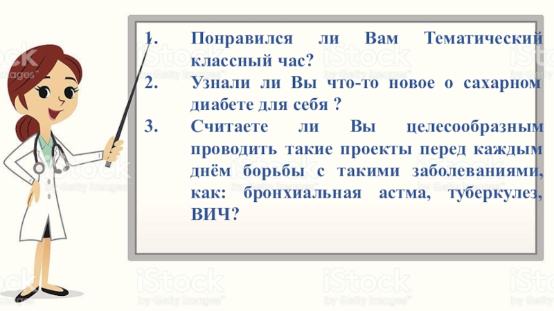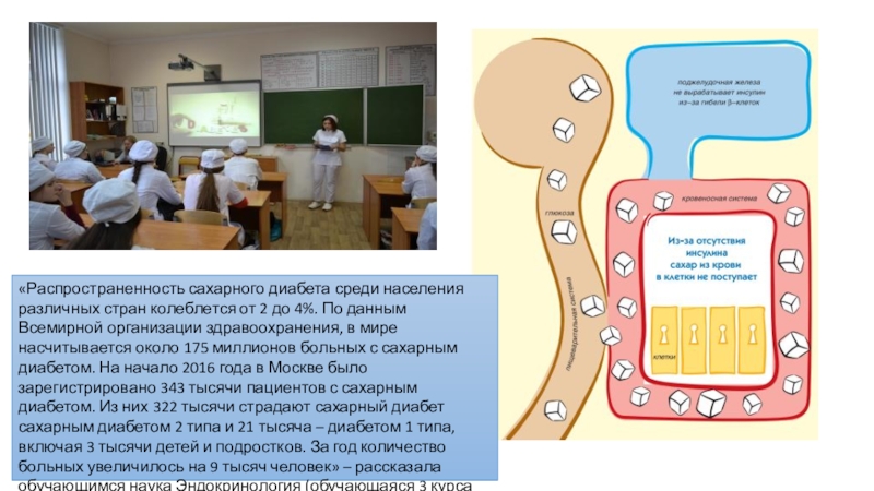4%. По данным Всемирной организации здравоохранения, в мире насчитывается около 175 миллионов больных с сахарным диабетом. На начало 2016 года в Москве было зарегистрировано 343 тысячи пациентов с сахарным диабетом. Из них 322 тысячи страдают сахарный диабет сахарным диабетом 2 типа и 21 тысяча – диабетом 1 типа, включая 3 тысячи детей и подростков. За год количество больных увеличилось на 9 тысяч человек» – рассказала обучающимся наука Эндокринология (обучающаяся 3 курса Ксения С.)