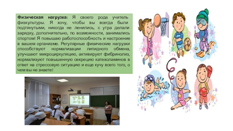 Слайд 17Физическая нагрузка: Я своего рода учитель физкультуры. Я хочу, чтобы вы