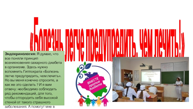 возникновения сахарного диабета в организме. Здесь нужно вспомнить Гиппократа «Болезнь легче предупредить, чем лечить». Но вы меня конечно спросите, а как же это сделать ? И я вам отвечу: необходимо соблюдать ряд рекомендаций, для того, чтобы отгородить себя высокой стеной от такого страшного заболевания. А помогут мне в этом мои друзья!