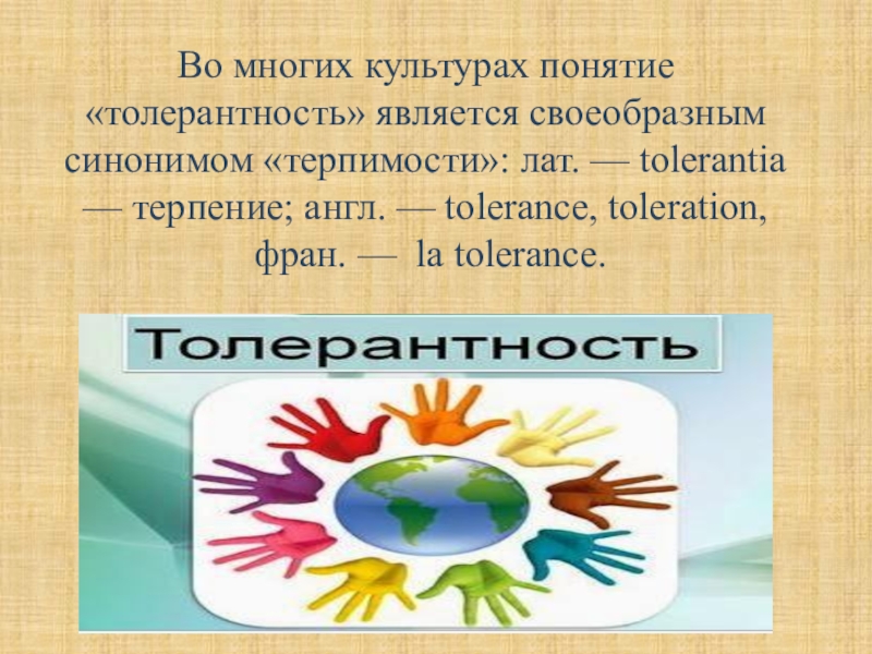 Слайд 3Во многих культурах понятие «толерантность» является своеобразным синонимом «терпимости»: лат. —