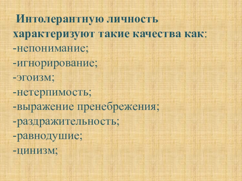 Слайд 6 Интолерантную личность характеризуют такие качества как: -непонимание; -игнорирование; -эгоизм; -нетерпимость; -выражение пренебрежения; -раздражительность; -равнодушие; -цинизм;