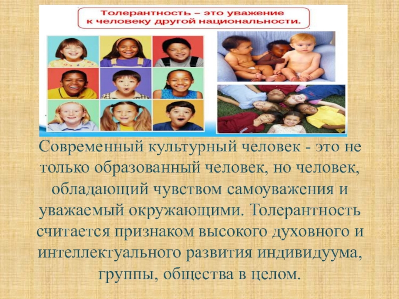 обладающий чувством самоуважения и уважаемый окружающими. Толерантность считается признаком высокого духовного и интеллектуального развития индивидуума, группы, общества в целом.