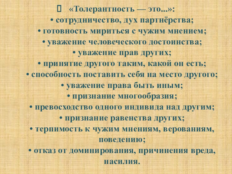Слайд 9«Толерантность — это...»: • сотрудничество, дух партнёрства; • готовность мириться с чужим мнением; •