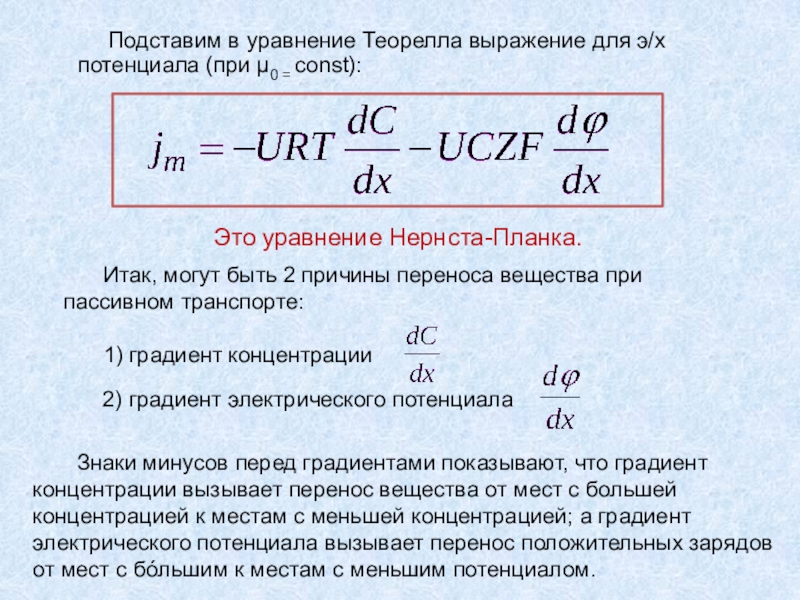 Знаки минусов перед градиентами показывают, что градиент концентрации вызывает перенос вещества от мест с большей концентрацией к местам с меньшей концентрацией; а градиент электрического потенциала вызывает перенос положительных зарядов от мест с бόльшим к местам с меньшим потенциалом.