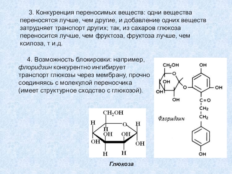 4. Возможность блокировки: например, флоридзин конкурентно ингибирует транспорт глюкозы через мембрану, прочно соединяясь с молекулой переносчика (имеет структурное сходство с глюкозой).