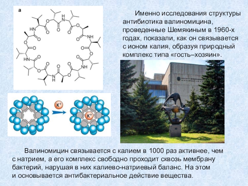 Именно исследования структуры антибиотика валиномицина, проведенные Шемякиным в 1960-х годах, показали, как он связывается с ионом калия, образуя природный комплекс типа «гость–хозяин».