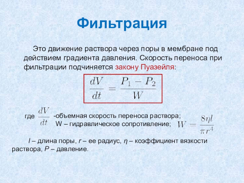 l – длина поры, r – ее радиус, η – коэффициент вязкости раствора, Р – давление.