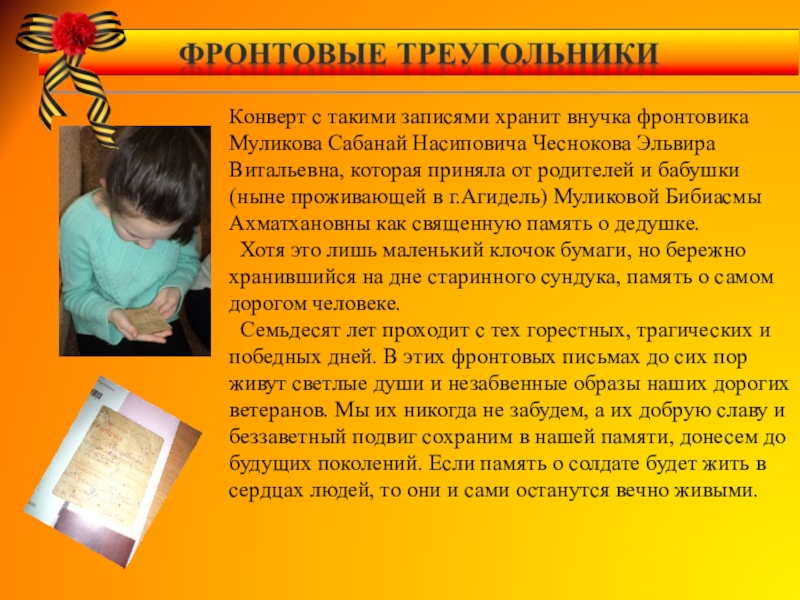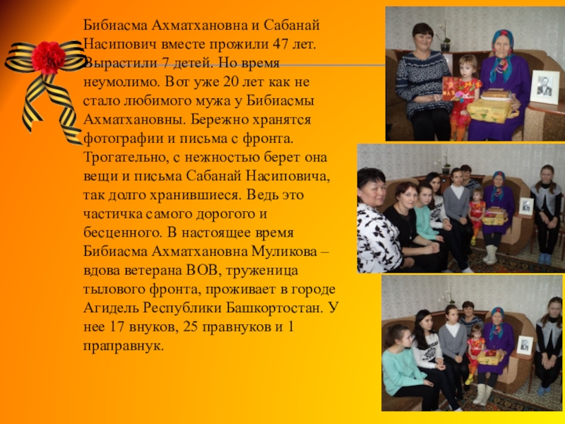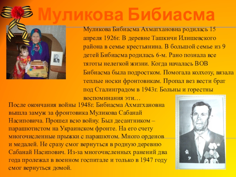 После окончания войны 1948г. Бибиасма Ахматхановна вышла замуж за фронтовика Муликова Сабанай Насиповича. Прошел всю войну. Был десантником – парашютистом на Украинском фронте. На его счету многочисленные прыжки с парашютом. Много орденов и медалей. Не сразу смог вернуться в родную деревню Сабанай Насипович. Из-за многочисленных ранений два года пролежал в военном госпитале и только в 1947 году смог вернуться домой.