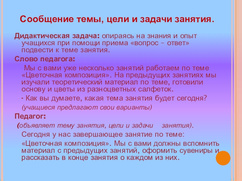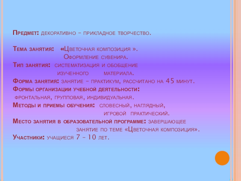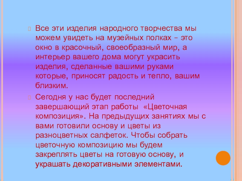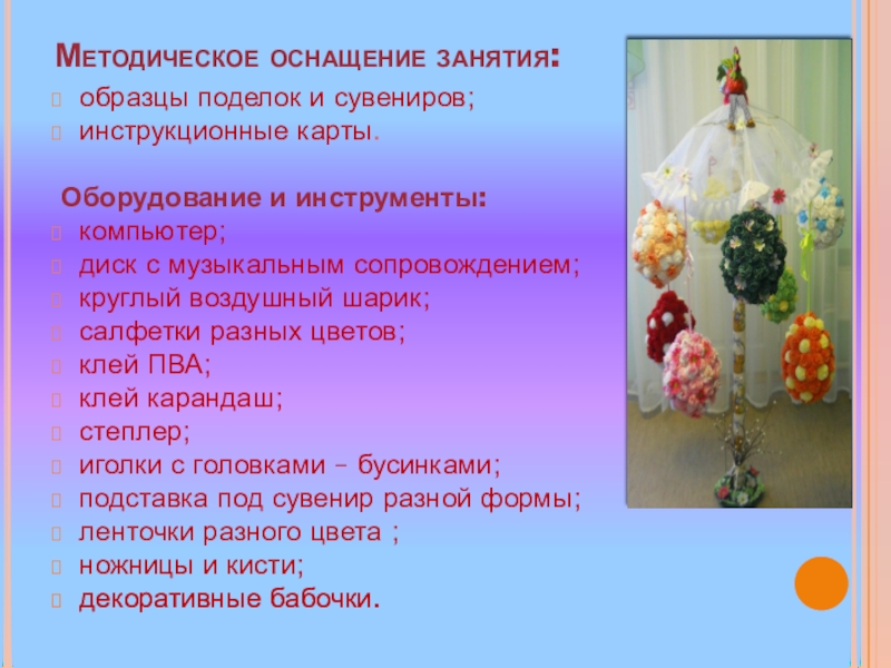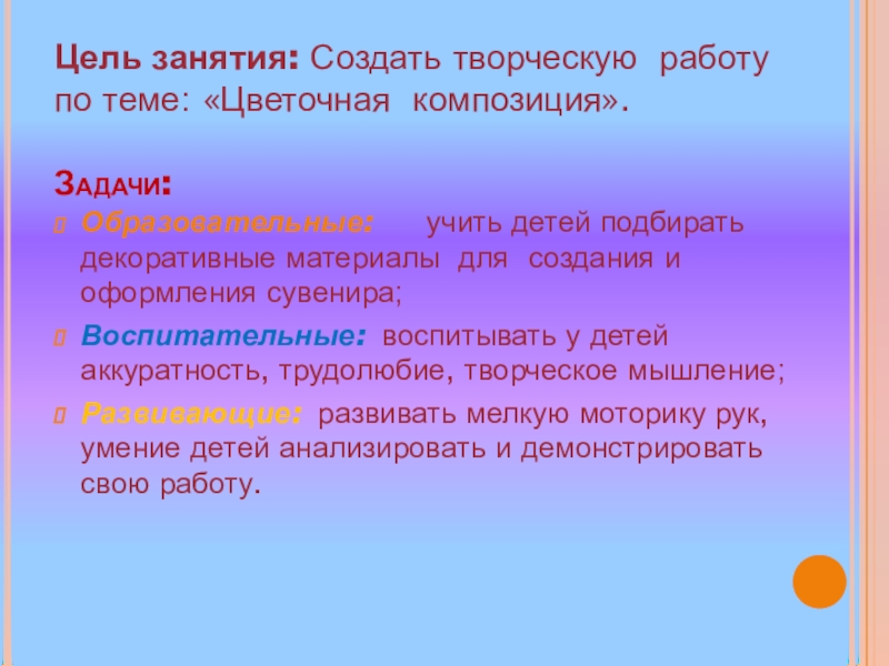 «Цветочная композиция». Мы с вами должны вспомнить материал с предыдущих занятий, оформить сувениры и рассказать в конце занятия о каждом из них.