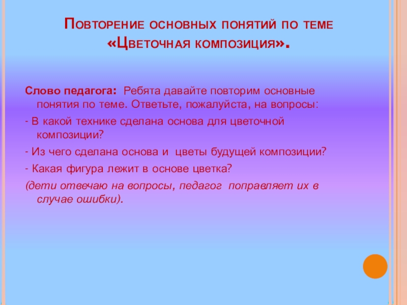 Слайд 15Повторение основных понятий по теме «Цветочная композиция».