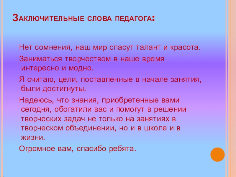 Надеюсь, что знания, приобретенные вами сегодня, обогатили вас и помогут в решении творческих задач не только на занятиях в творческом объединении, но и в школе и в жизни.