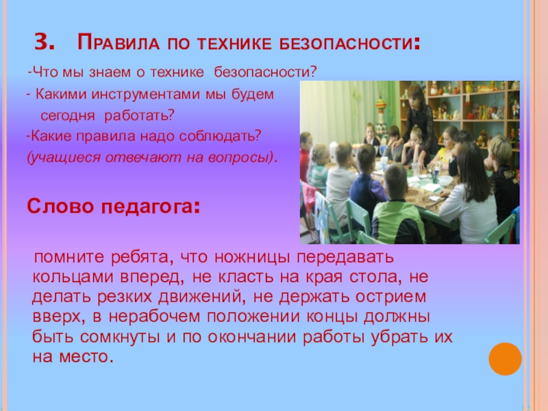 помните ребята, что ножницы передавать кольцами вперед, не класть на края стола, не делать резких движений, не держать острием вверх, в нерабочем положении концы должны быть сомкнуты и по окончании работы убрать их на место.