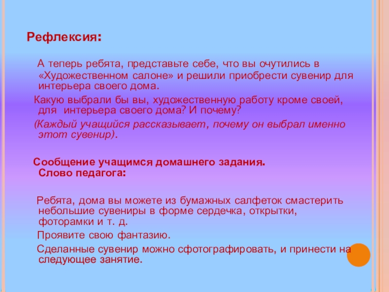 (Каждый учащийся рассказывает, почему он выбрал именно этот сувенир).