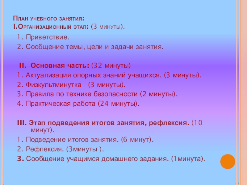 Форма занятия: занятие – практикум, рассчитано на 45 минут.