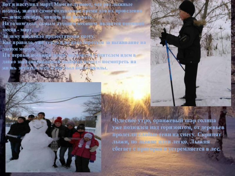 Чудесное утро, оранжевый шар солнца уже поднялся над горизонтом, от деревьев пролегли слабые тени на снегу. Скрипят лыжи, по лыжне идти легко. Лыжня сбегает с пригорка и устремляется в лес.