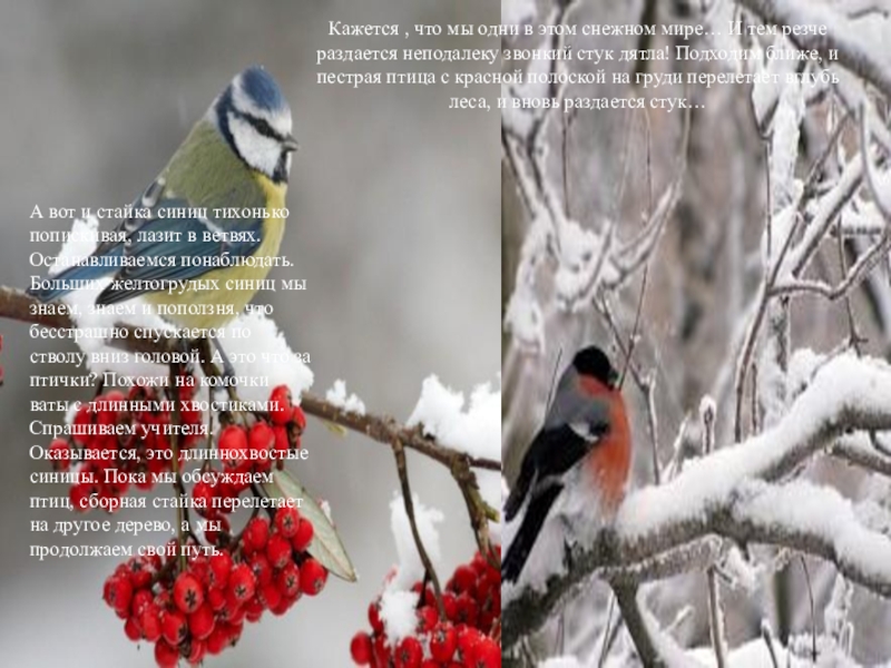 А вот и стайка синиц тихонько попискивая, лазит в ветвях. Останавливаемся понаблюдать. Больших желтогрудых синиц мы знаем, знаем и поползня, что бесстрашно спускается по стволу вниз головой. А это что за птички? Похожи на комочки ваты с длинными хвостиками. Спрашиваем учителя. Оказывается, это длиннохвостые синицы. Пока мы обсуждаем птиц, сборная стайка перелетает на другое дерево, а мы продолжаем свой путь.