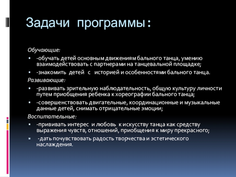 -обучать детей основным движениям бального танца, умению взаимодействовать с партнерами