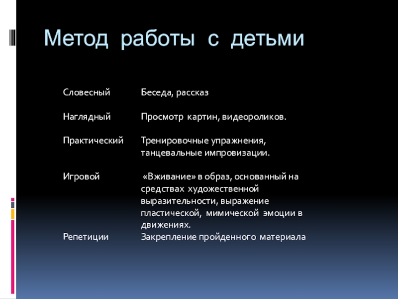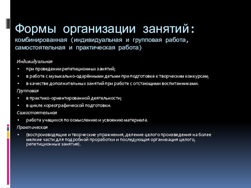 (воспроизводящие и творческие упражнения, деление целого произведения на более мелкие части для подробной проработки и последующая организация целого, репетиционные занятия).