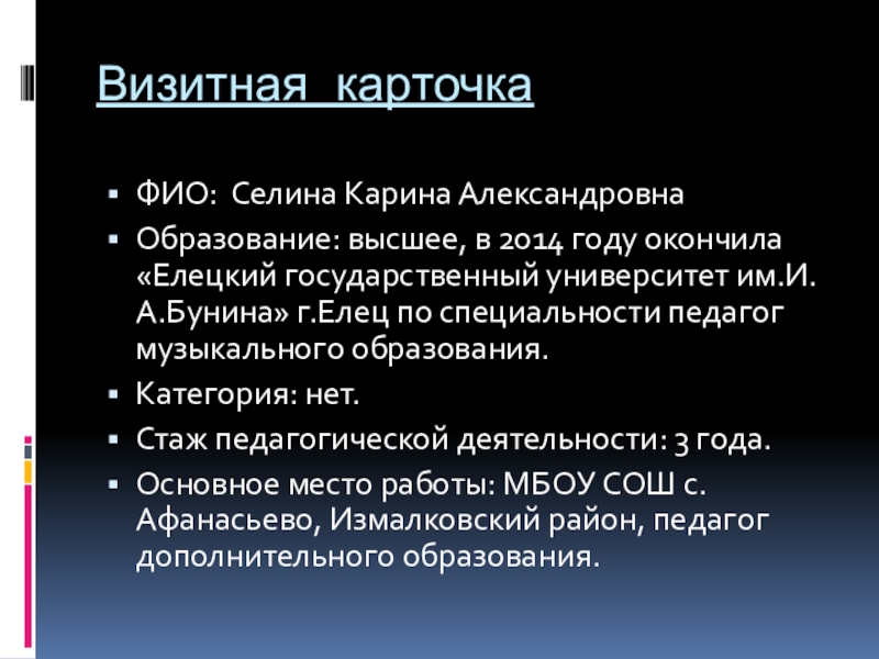 государственный университет им.И.А.Бунина» г.Елец по специальности педагог музыкального образования.