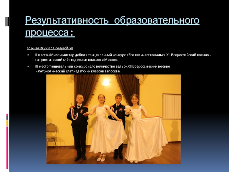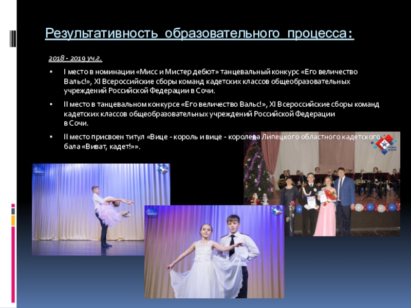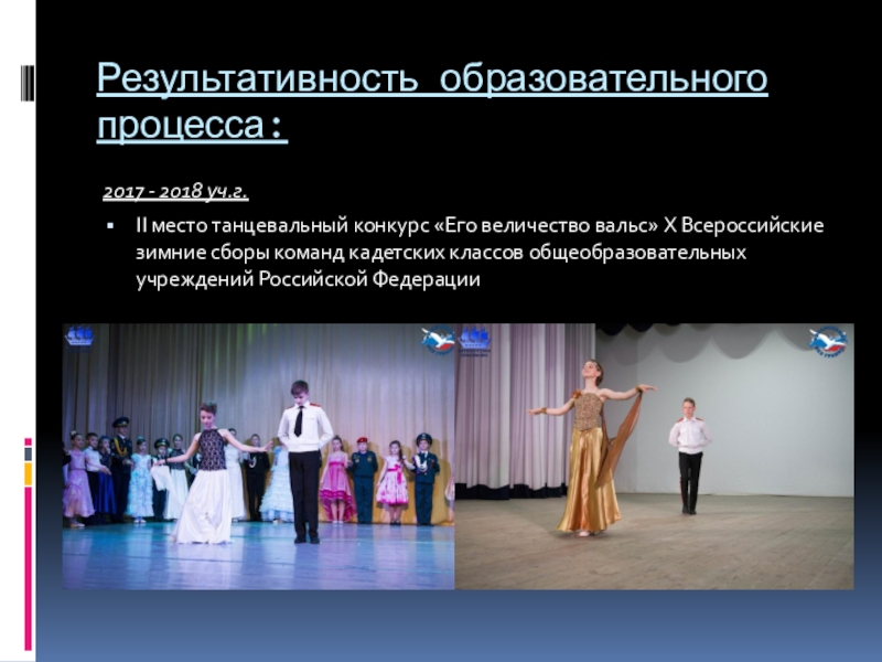 II место в танцевальном конкурсе «Его величество Вальс!», XI Всероссийские сборы команд кадетских классов общеобразовательных учреждений Российской Федерации