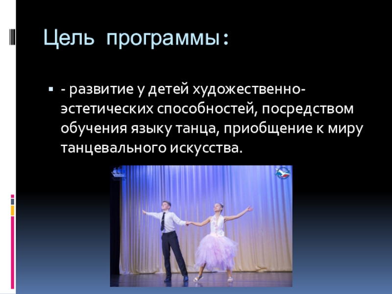 -прививать интерес и любовь к искусству танца как средству выражения чувств, отношений, приобщения к миру прекрасного;