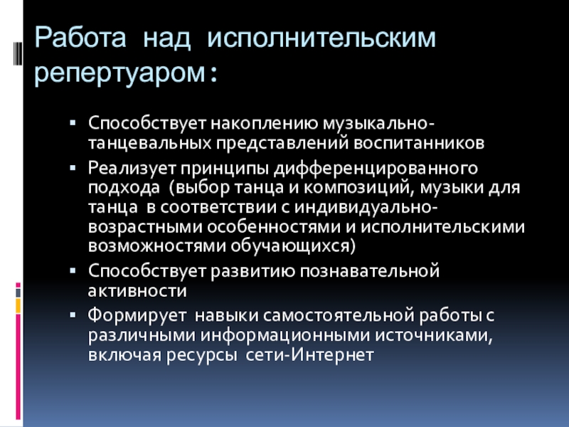Способствует накоплению музыкально-танцевальных представлений воспитанников