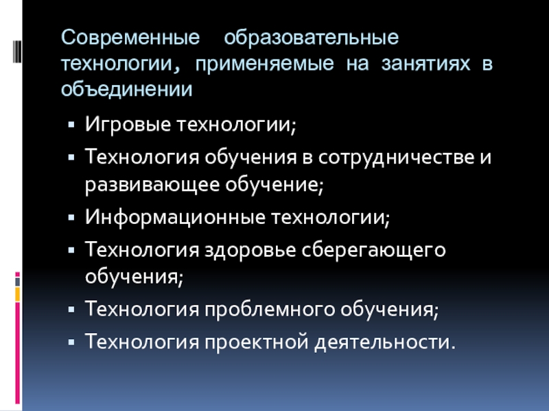 Слайд 10Современные образовательные технологии, применяемые на занятиях в объединении