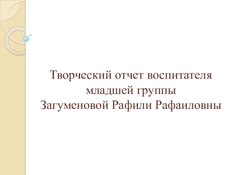 Слайд 1Творческий отчет воспитателя младшей группы Загуменовой Рафили Рафаиловны