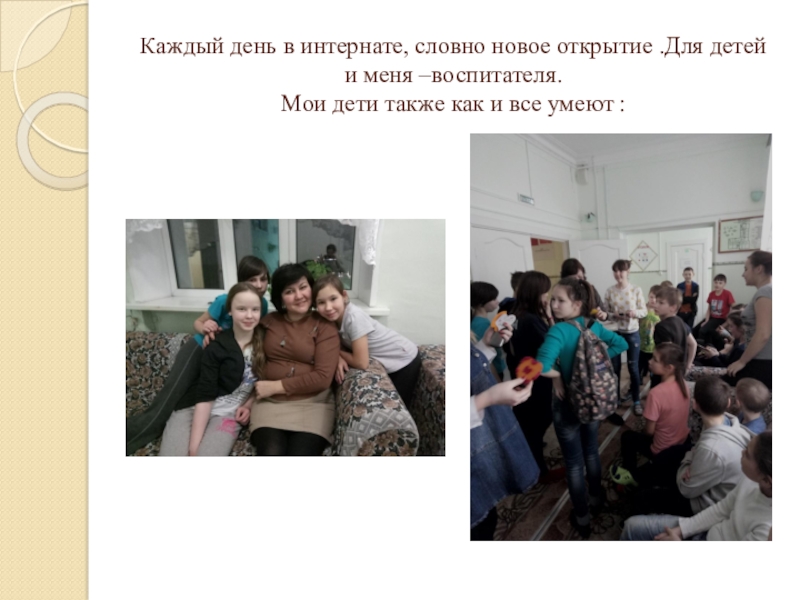 Каждый день в интернате, словно новое открытие .Для детей и меня –воспитателя. Мои дети также как и все умеют :