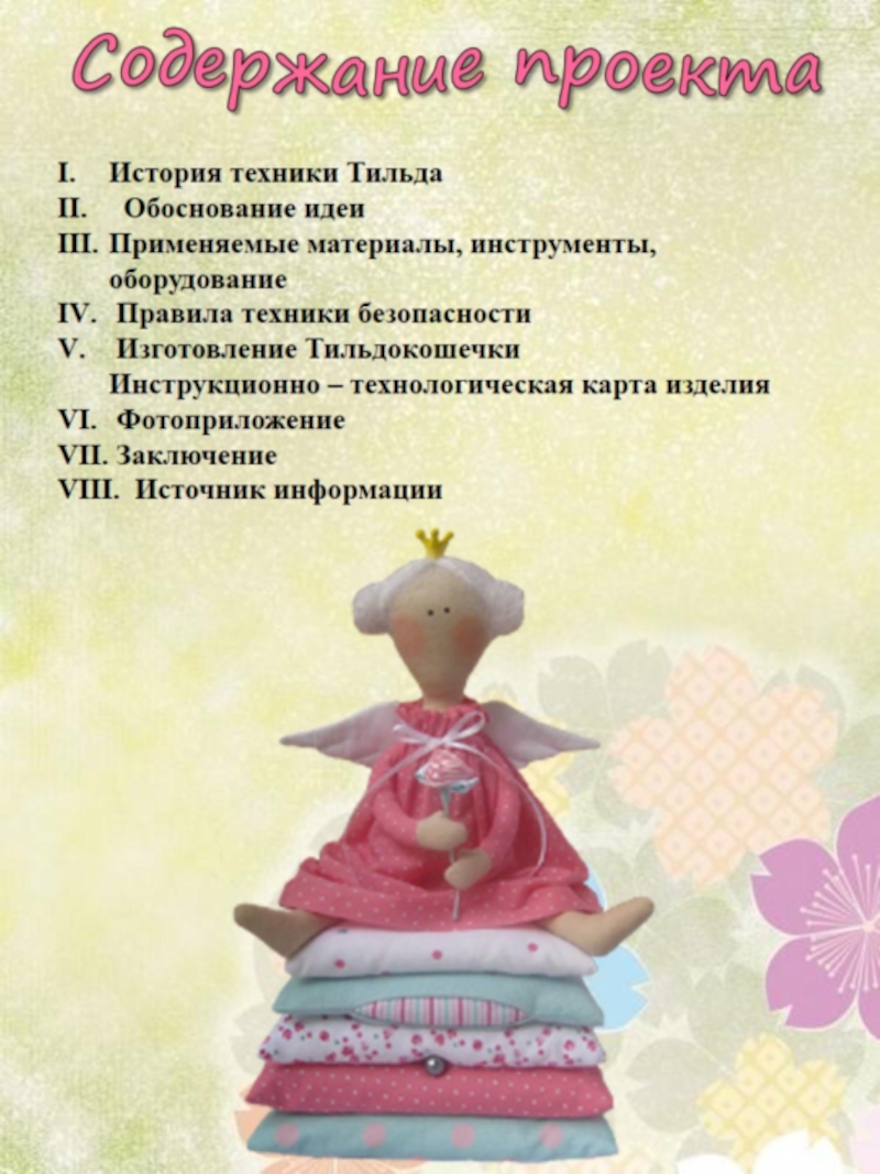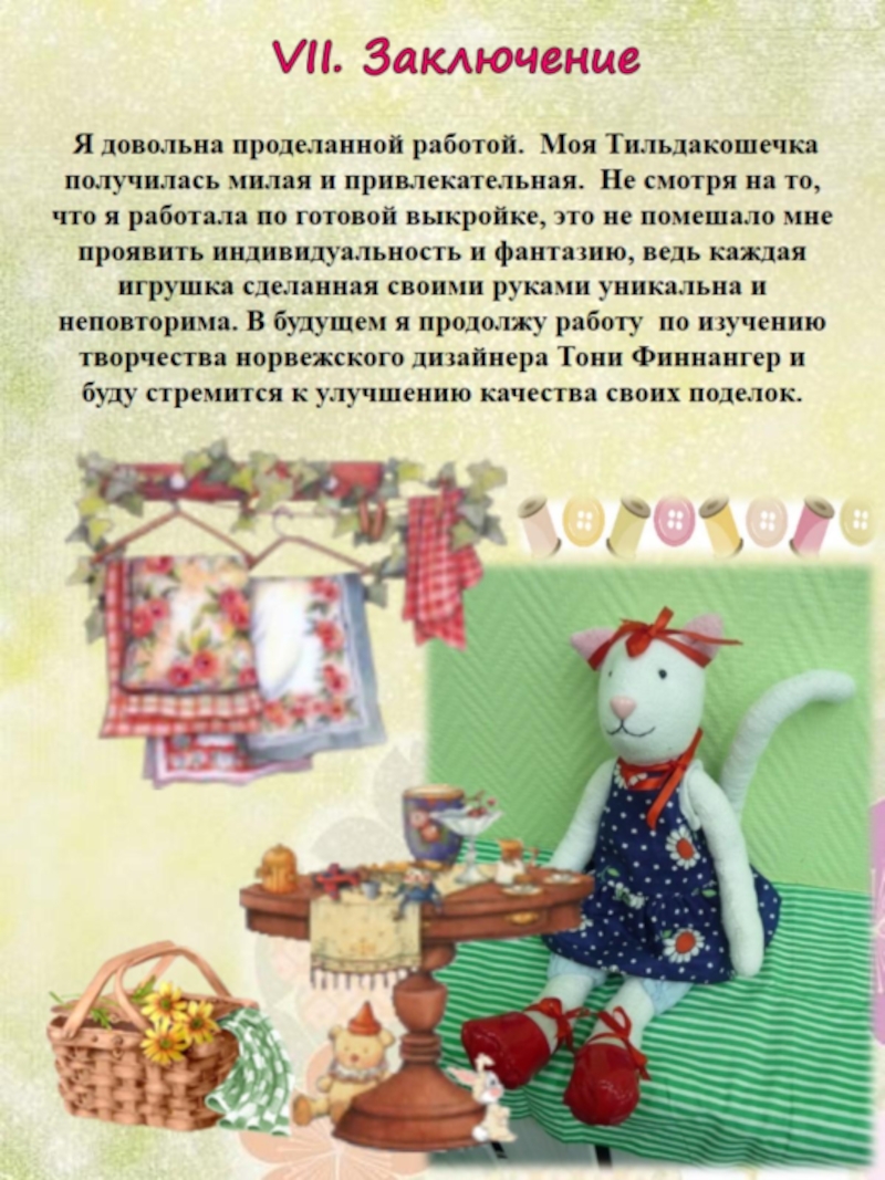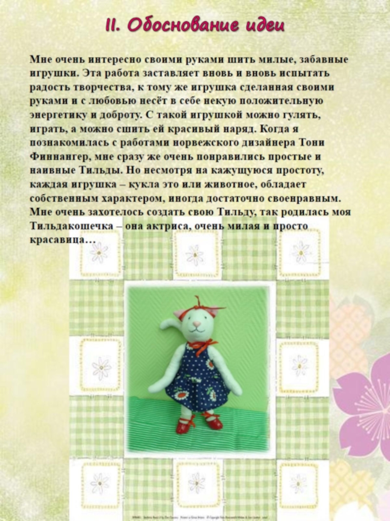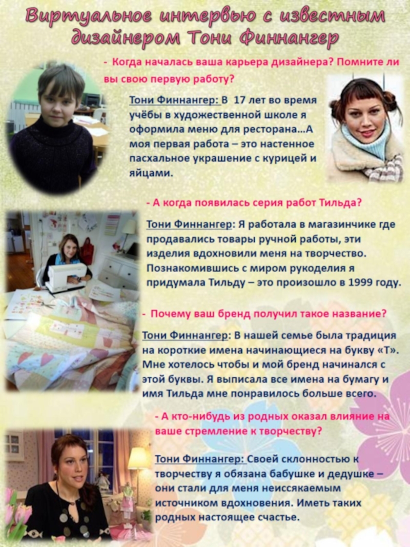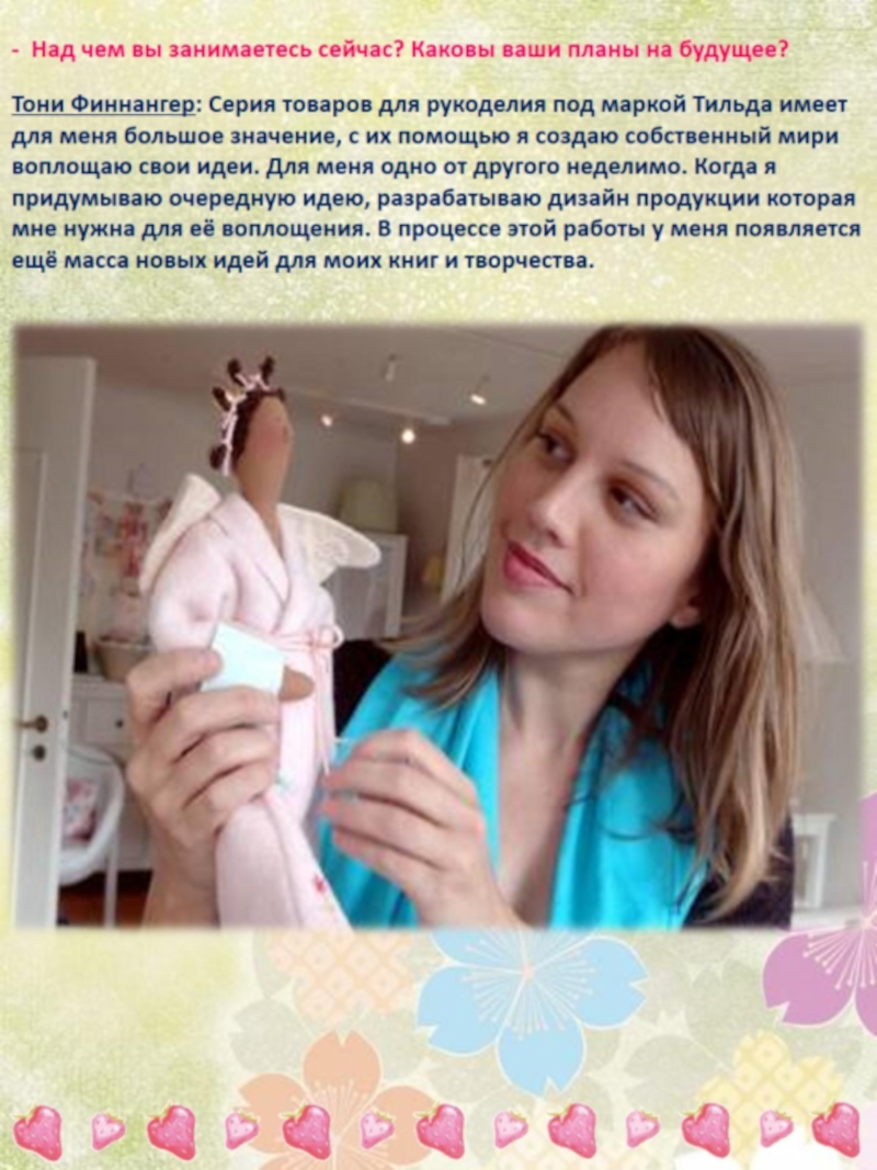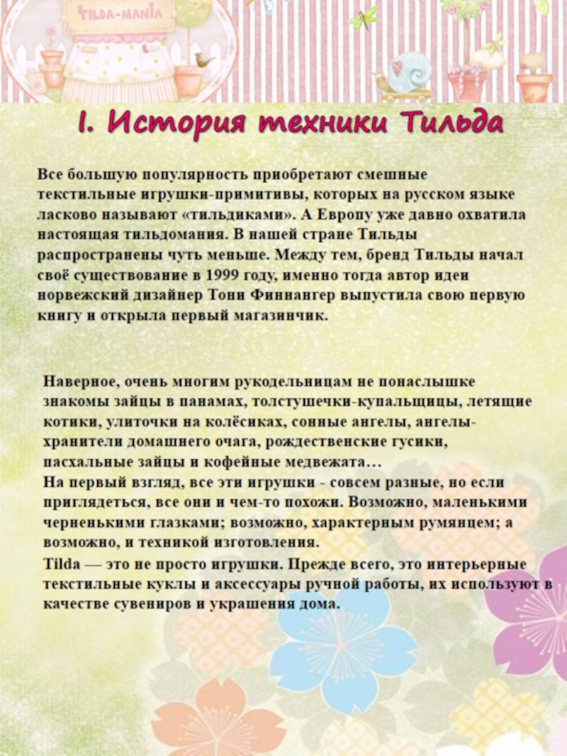 Проект знакомит с работой норвежского дизайнера Тони Финнангер, мастера текстильных интерьерных кукол и аксессуаров ручной работы, которые во всём мире известны как Тильда и пользуются заслуженной популярностью.