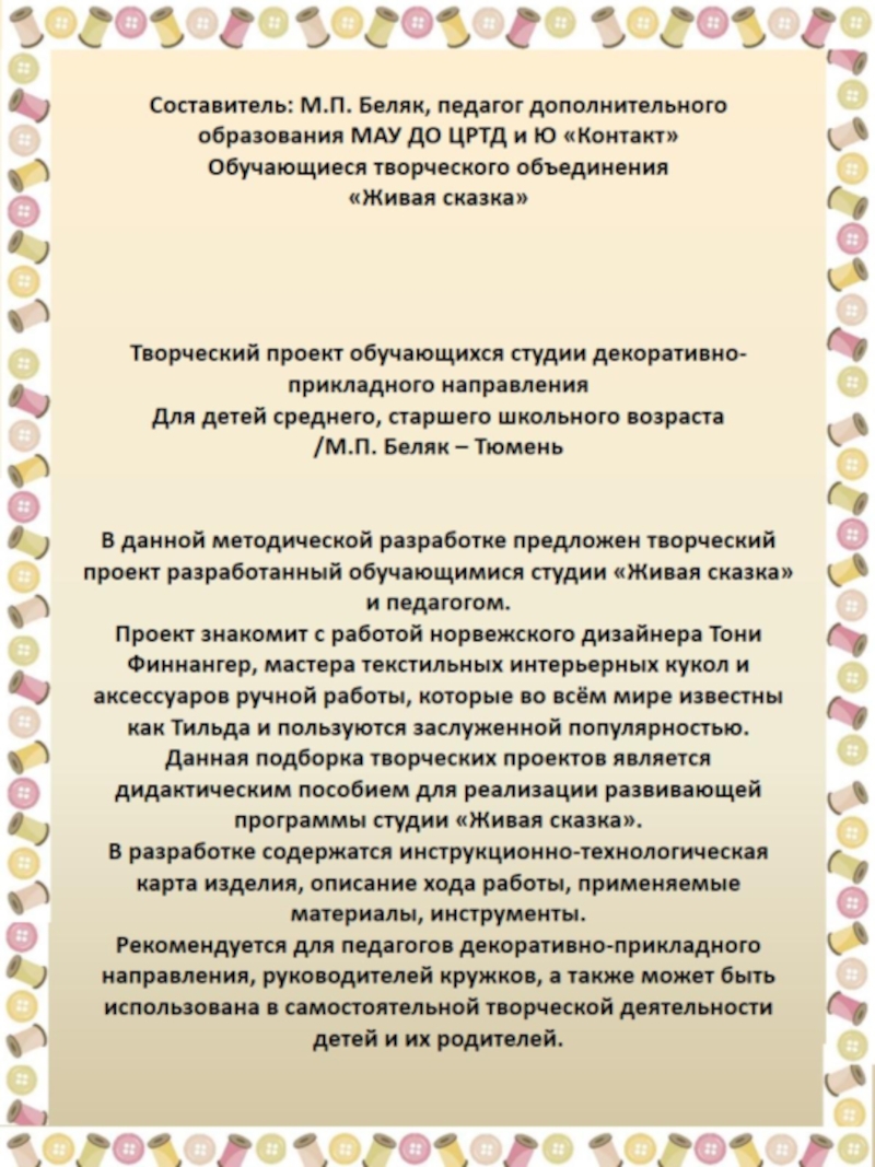 В данной методической разработке предложен творческий проект разработанный обучающимися студии «Живая сказка» и педагогом.