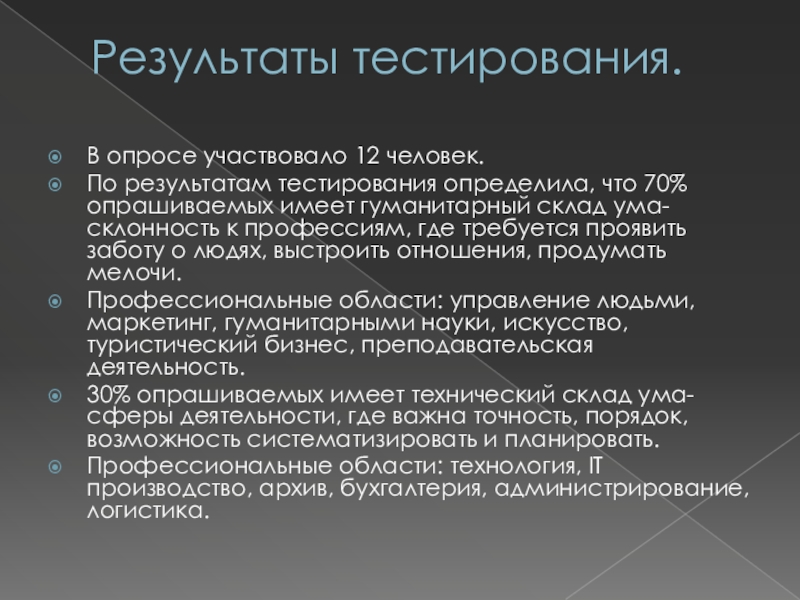 опрашиваемых имеет гуманитарный склад ума- склонность к профессиям, где требуется проявить заботу о людях, выстроить отношения, продумать мелочи.