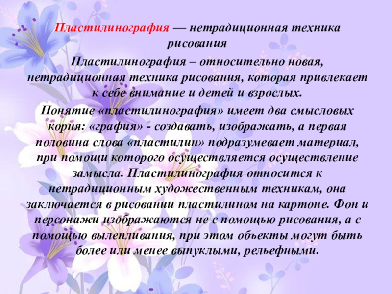 Понятие «пластилинография» имеет два смысловых корня: «графия» - создавать, изображать, а первая половина слова «пластилин» подразумевает материал, при помощи которого осуществляется осуществление замысла. Пластилинография относится к нетрадиционным художественным техникам, она заключается в рисовании пластилином на картоне. Фон и персонажи изображаются не с помощью рисования, а с помощью вылепливания, при этом объекты могут быть более или менее выпуклыми, рельефными.